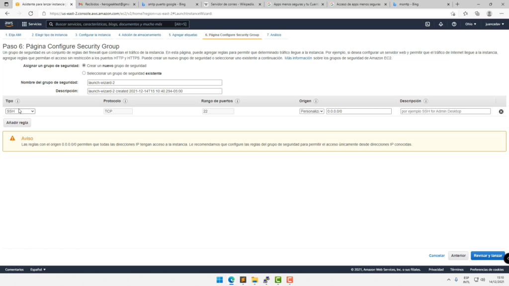 Para empezar, yo he creado absolutamente todo nuevo, tanto la cuenta como el servidor donde vamos a trabajar. En este caso he creado un servidor Ubuntu en Amazon AWS. Como ustedes pueden ver en el video la creación de este servidor no es nada difícil. Solamente hay que tener en cuenta que debemos de configurar los puertos adecuados, en este caso el SMTP de Google que es \ 587