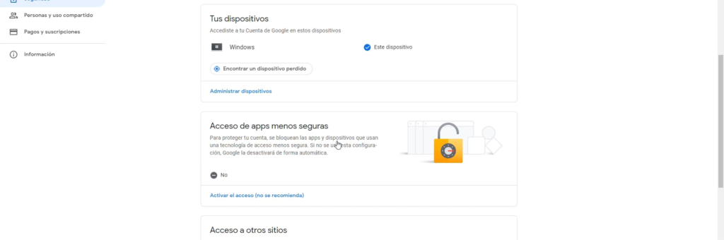 Cerramos con Ctrl+X y guardamos los cambios aceptando con Y. La información que se muestra en el video es información que he creado especialmente para este tutorial, así que no quieran hacer travesuras y más que seguro que ya he cambiado todas las credenciales, en esta configuración deben poner los datos de la cuenta que vayan a usar para esto. En el video se muestra un error al intentar probar MSMTP desde la terminal, para que esto no pase debemos al apartado de seguridad en ajustes de nuestra cuenta Gmail